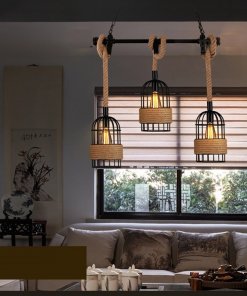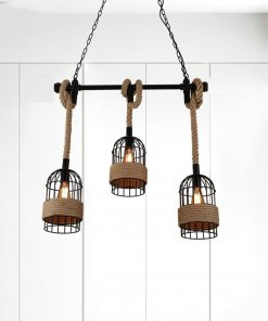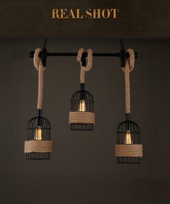 Lámpara Colgante Vintage Industrial Cuerdas de Cáñamo 3 Jaulas de Hierro