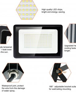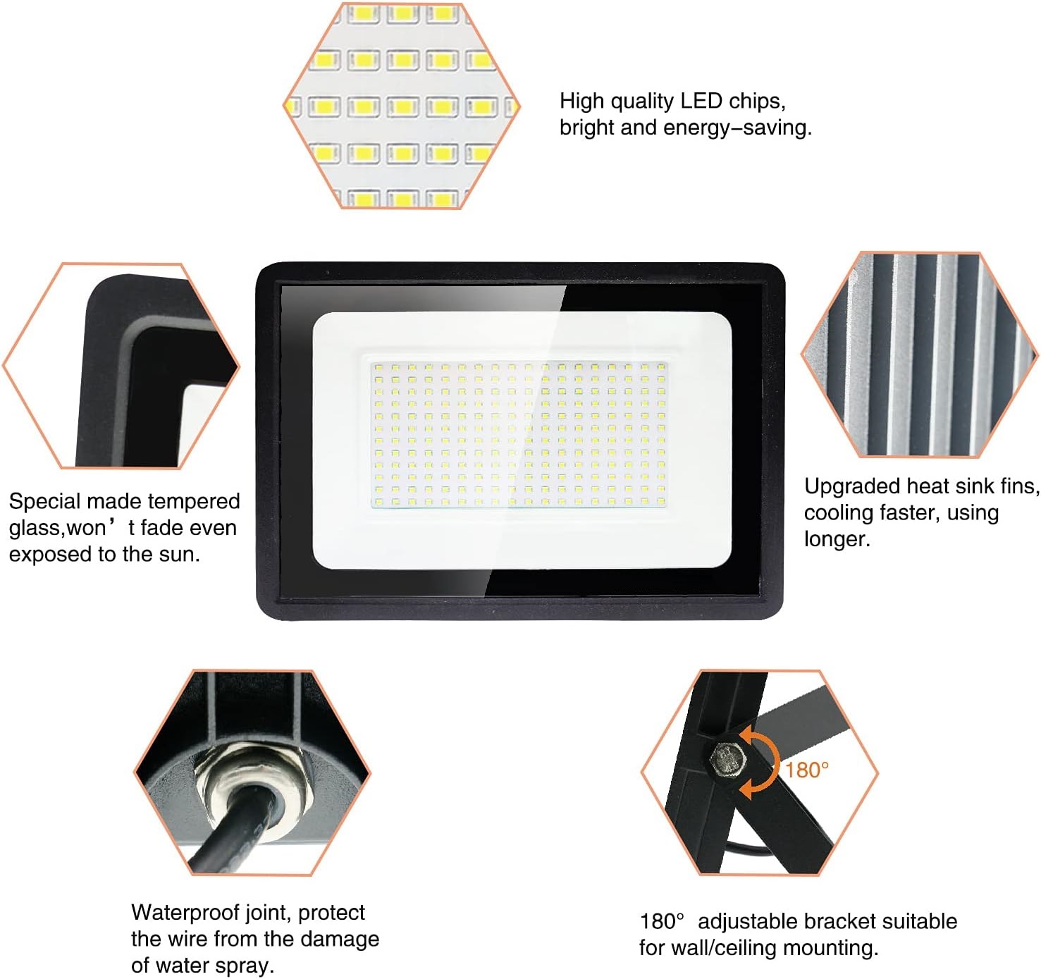 Con un soporte giratorio de 180 grados, este foco proyector emite un amplio haz de luz, facilitando la iluminación en múltiples escenarios como garaje, estacionamiento, almacén, patio, piscina, jardín, árbol, vallas publicitarias, paredes de edificios, puentes, piscinas… iluminación interior y exterior.