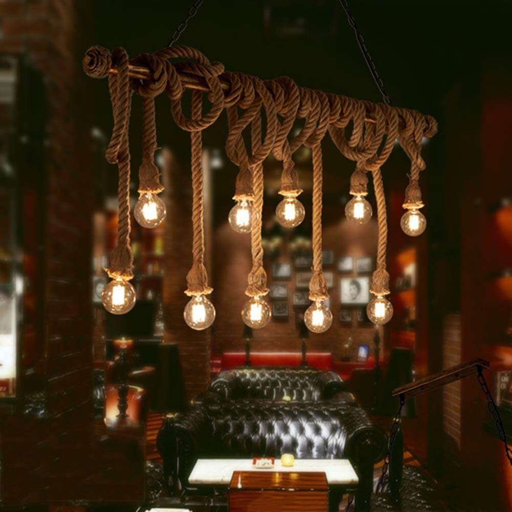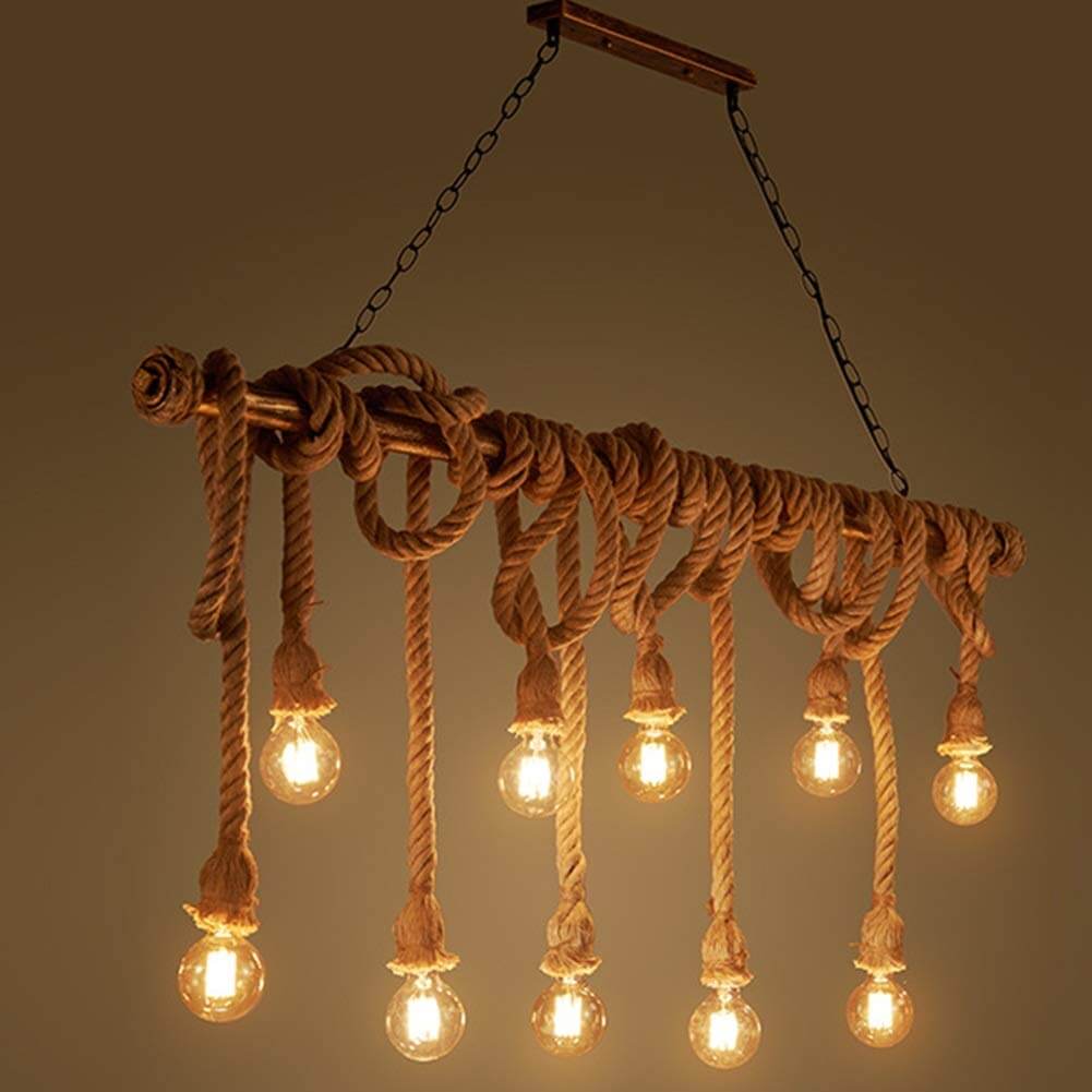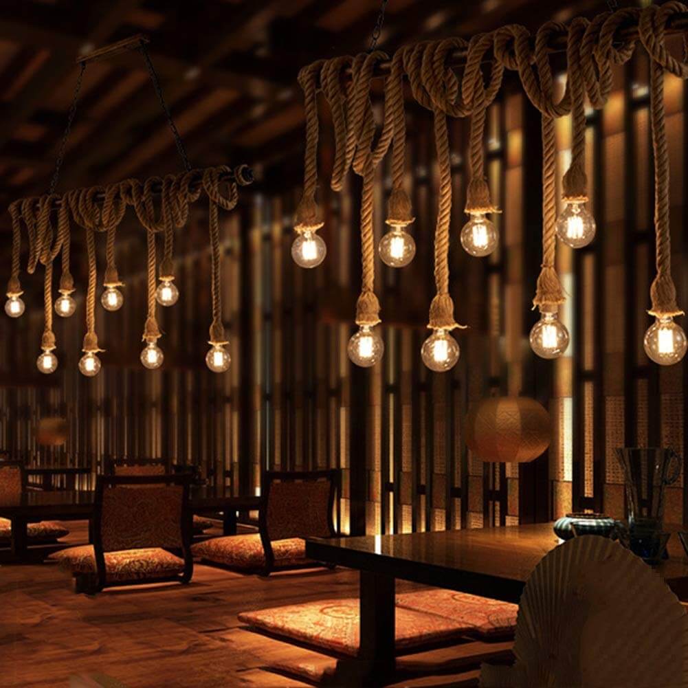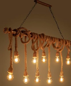 LÁMPARA COLGANTE DE TUBERÍA CON DIEZ PORTALÁMPARAS FABRICADOS EN CUERDA DE CÁÑAMO.