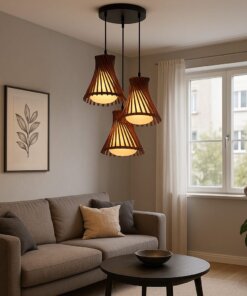 Esta elegante lámpara colgante triple combina la calidez de la madera con la sofisticación del vidrio opal, creando un efecto de luz suave y acogedor ideal para comedores, salas o bares.