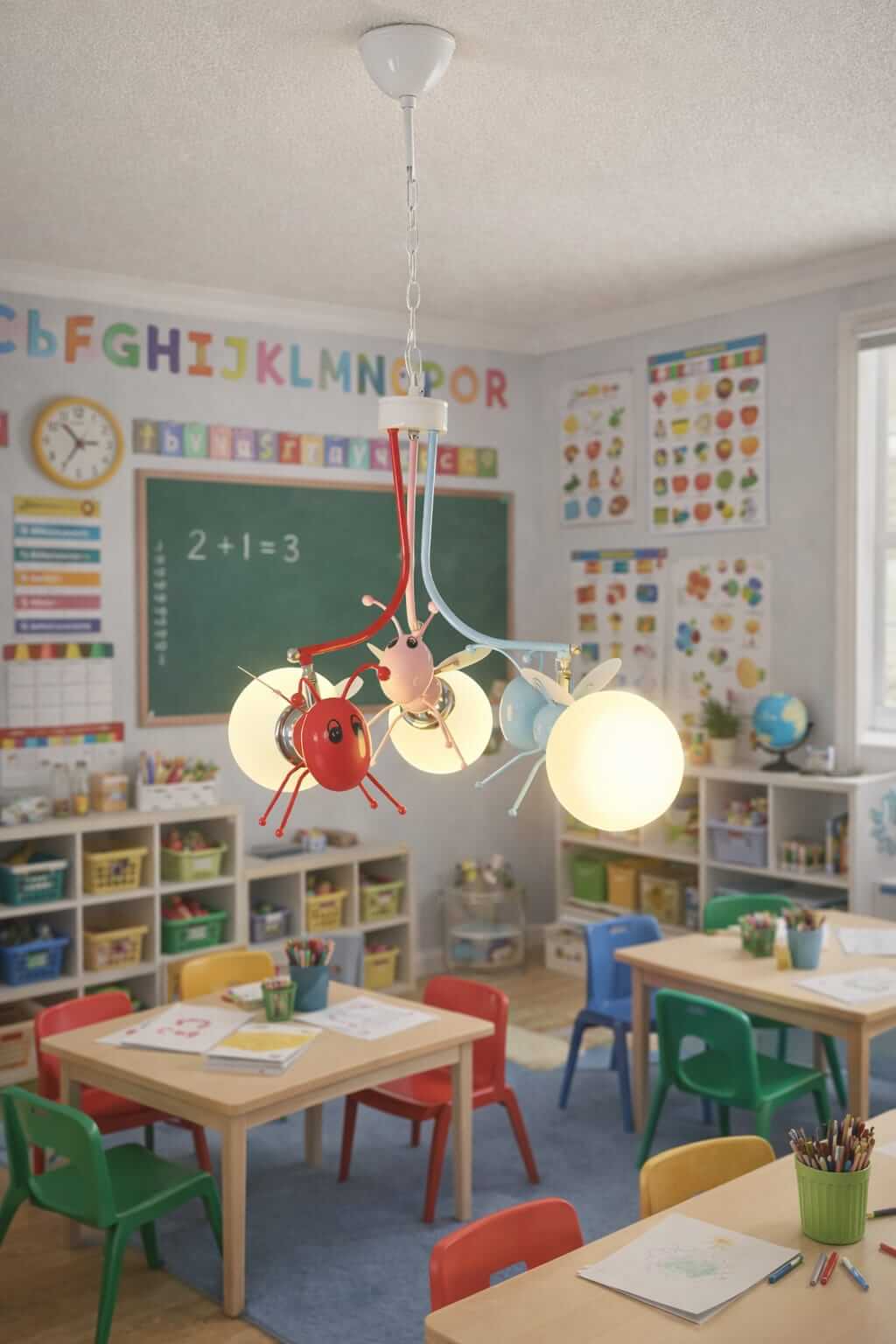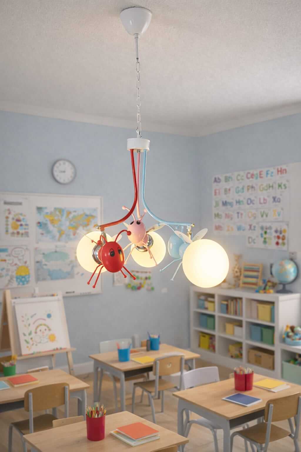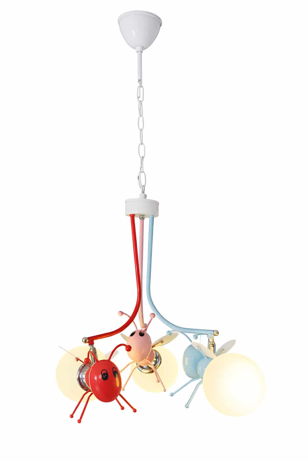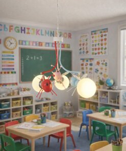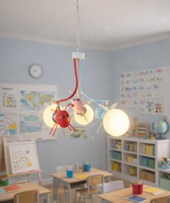 Este colgante tipo Luciernagas incluye tres focos de vidrio opal que brindan luz suave, ideal para dormitorios de niños y salas de juegos.
