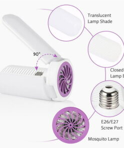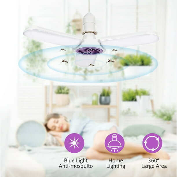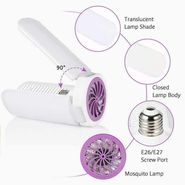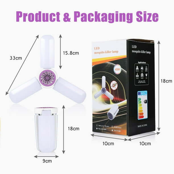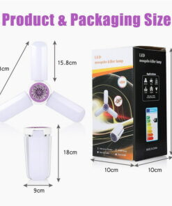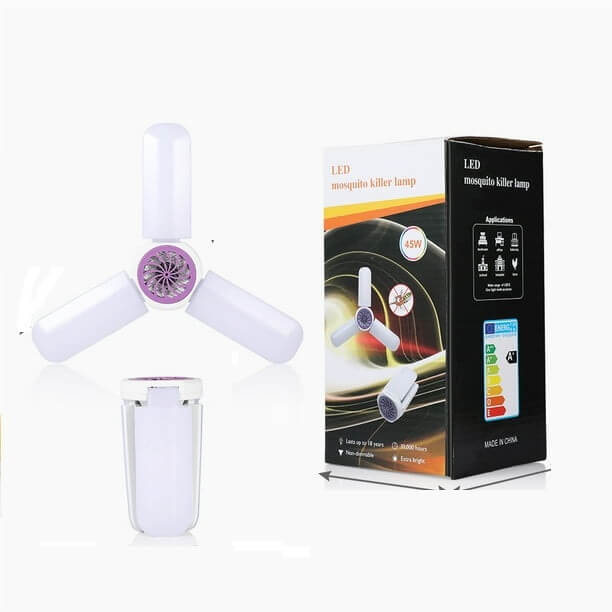 Diseño plegable de 3 hojas LED para mayor cobertura lumínica. Incluye sistema mata mosquitos UV + ventilador interno. No tóxico, sin químicos, sin humo ni olores. Alta eficiencia energética A+. Encendido rápido y luz uniforme. Duradera y de bajo consumo comparado con otras lámparas y aparatos repelentes. Usos Recomendados Dormitorios Salas de estar, Terrazas techadas, Balcones, Cocinas, Oficinas, Hoteles y restaurantes, Bodegas o espacios donde haya proliferación de insectos Iluminación + Control de insectos en un solo producto, reduce la presencia de mosquitos de manera segura y silenciosa, ahorra energía gracias a su tecnología LED de alta eficiencia, cubre un área más amplia gracias a sus paletas ajustables, Instalación rápida: solo enroscar en un soquete E27 estándar, larga vida útil, minimizando reemplazos